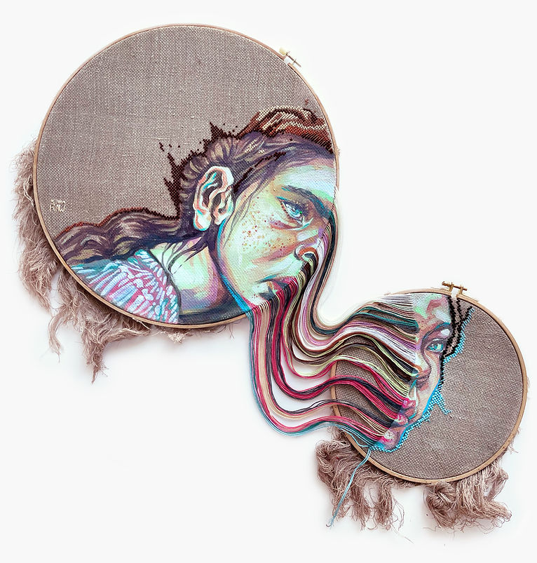 I used the image of a digital glitch because the models in the paintings are digital as well, but I depicted them through embroidery, a very tactile and human medium.